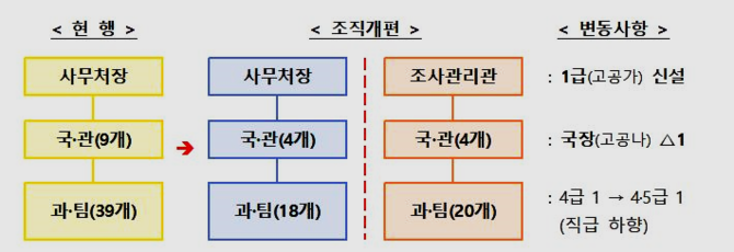각국에 흩어져있던 정책·조사 업무를 기능별로 1∼4개씩 묶어 재편했다. 조사와 정책 국·관을 동수로 구성하되 인력 배치는 정책 180여명(업무지원 부서 포함)·조사 220여명 안팎으로 조사에 약간 더 무게를 뒀다.
