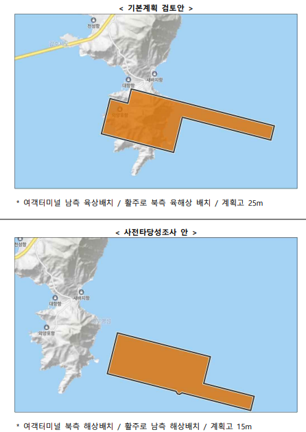 공항은 육상과 해상에 걸쳐 계획하는 배치안을 선정했다. 추후 여객터미널, 화물터미널, 계류장 등 공항시설 배치 계획과 관계기관 협의 의견을 반영하는 최적화 검토를 거쳐 최종 공항 배치를 확정할 예정이다.