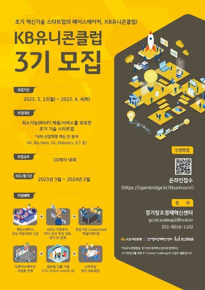 18일 KB국민은행에 따르면 2021년부터 시작된 KB유니콘클럽은 3년차 이하 혁신기술 기반 스타트업을 대상으로 맞춤형 엑셀러레이팅 및 직접투자까지 실행하는 초기 스타트업 성장 지원 프로그램이다.