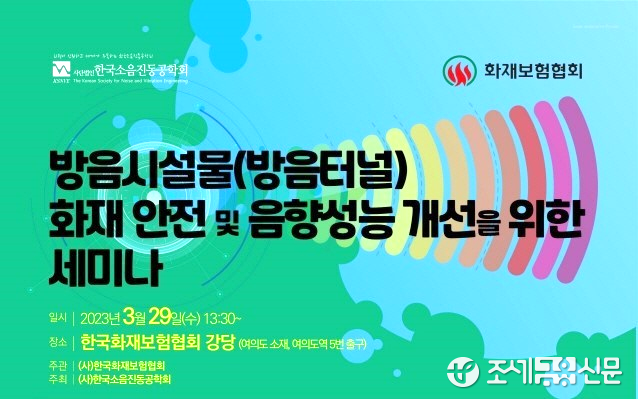 (조세금융신문=김종태 기자) 한국화재보험협회가 한국소음진동공학회와 공동으로 오는 29일 서울 여의도 화재보험협회 강당에서 '방음시설물(방음터널) 화재 안전 및 음향성능 개선을 위한 세미나'를 개최한다고 밝혔다.