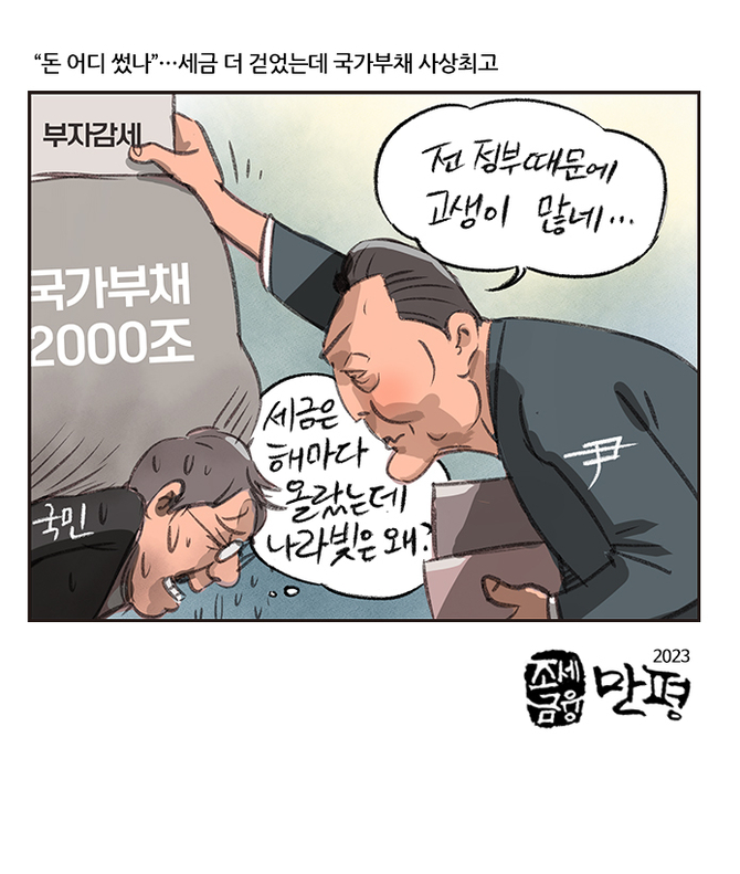 [조세금융만평] "돈 어디 썼나"…세금 더 걷었는데 국가부채 사상최고