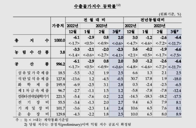 수출물가지수는 1년 전과 비교하면 6.4% 내렸다. 서 팀장은 "전년 동월 비로는 석유제품 가격이 내리고 반도체를 중심으로 정보기술(IT) 가격 내림세가 지속됐다"고 설명했다.
