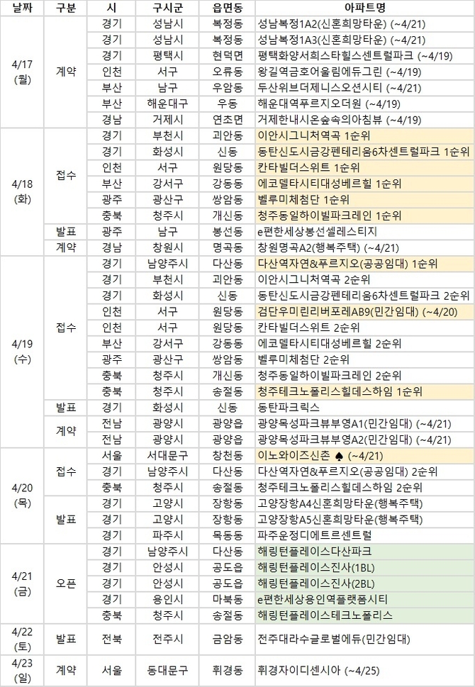 14일 부동산R114에 따르면 2023년 4월 셋째 주에는 전국 10개 단지 총 6319가구(일반분양 4241가구)가 분양을 시작한다.