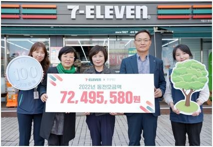 편의점 세븐일레븐은 19일 지구의날(4월 22일)을 앞두고 전국 가맹점에서 동전 모으기 활동을 통해 모은 7천200만원을 환경재단에 전달했다고 밝혔다.