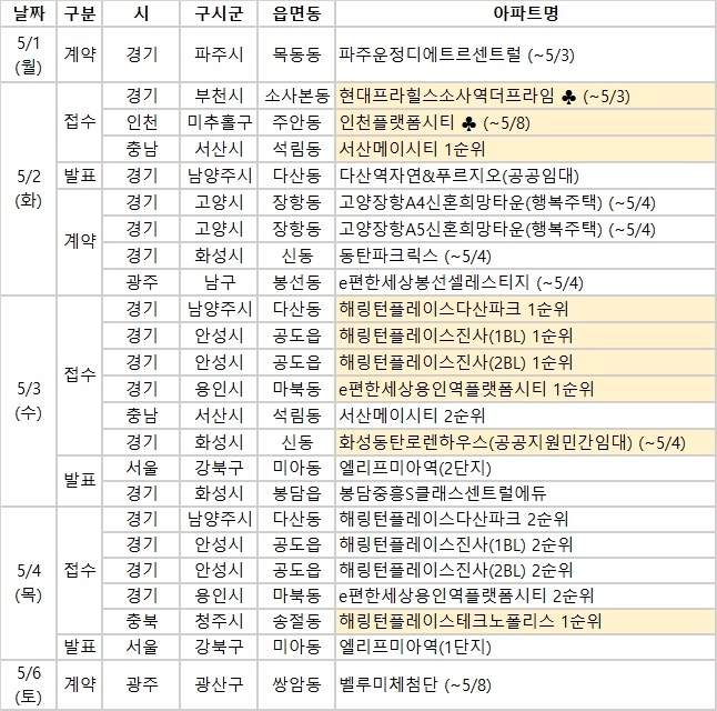 5월 첫 째 주 모델하우스는 문을 여는 단지가 없다.