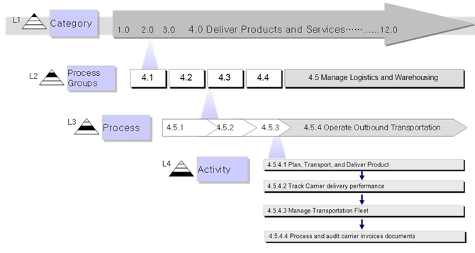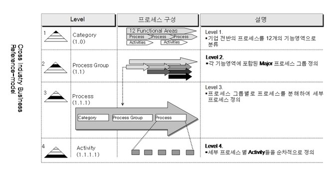 PCF는 Level 1 ~ Level 4 계층 구조로 정의되고, 프로세스 1500개 이상의 상호연관 관계에 대한 참조 (Reference Model)을 제공하고 있으며 그의 구성을 도식화하면 다음 <표1>, <표2>와 같다.