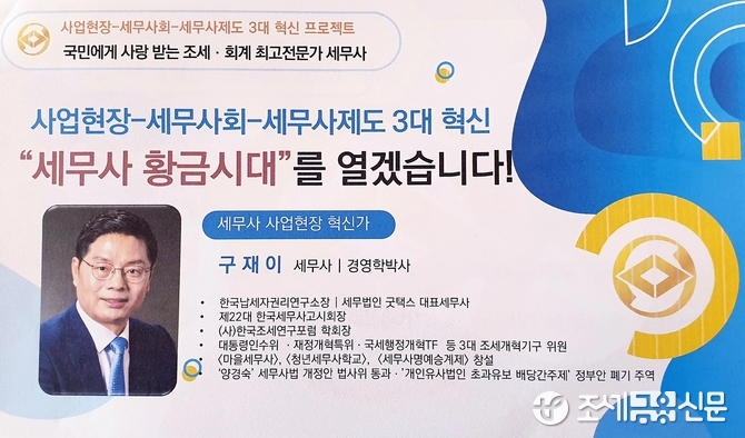 (조세금융신문=김영기 기자) 자칭 혁신의 아이콘, 구재이 세무사가 1일 서울 삼성동 인터컨티넬탈호텔에서 ‘제33대 한국세무사회장 출마 기자회견 및 혁신발표회’를 갖고 세무사 사업현장, 세무사회, 세무사제도 등의 3대 혁신으로 ‘세무사 황금시대’를 열겠다고 출마의 변을 밝혔다.