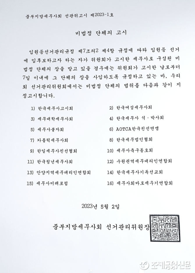 (조세금융신문=김영기 기자) 중부지방세무사회 선거관리위원회(위원장 목명근)는 내달 20일 치러지는 차기 중부지방세무사회장 선거와 관련, 세무사업계의 친목단체인 ‘비법정단체’ 16곳을 지정하여 2일 고시했다.