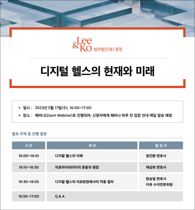 이날 웨비나에는 광장 헬스케어그룹장 정진환 변호사(사법연수원 29기)가 ‘디지털 헬스의 이해’를 주제로 발표하고, 이어 지식재산권 자문 및 소송, 개인정보보호, 공정거래 등 각종 규제법률 분야 전문가인 광장 채성희 변호사(35기)가 ‘의료마이데이터의 동향과 쟁점’을 설명한다.