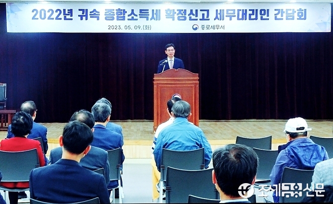 (조세금융신문=김영기 기자) 종로세무서(서장 공병규)는 9일 대강당에서 종로지역세무사회(회장 김정엽)와 2022년 귀속 종합소득세 신고와 관련해 간담회를 갖고 신고방향을 비롯한 성실신고 안내를 당부했다.