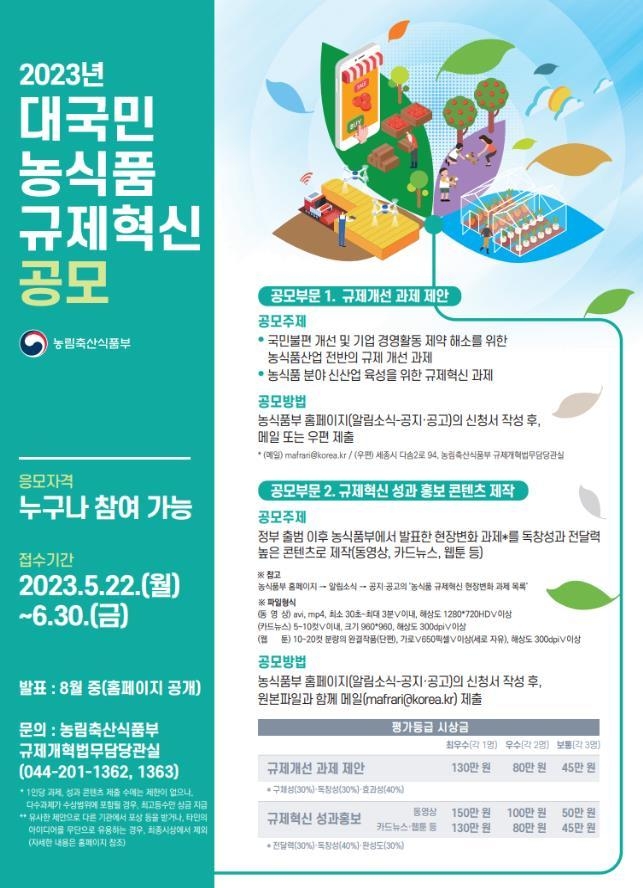 농식품부에 따르면 이번 공모는 규제 개선 과제나 새로운 제도를 제안하는 아이디어 부문과 규제혁신 성과를 동영상, 카드 뉴스 등으로 제작하는 홍보 콘텐츠 부문 등 2개 부문으로 진행된다.