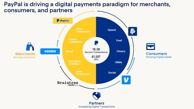먼저 페이팔 자체 서비스는 소비자와 판매자를 잇는 B2C(business-to-consumer) 결제 서비스를 제공한다. 브레인트리는 이커머스 기업들을 위한 전자 결제 솔루션을 제공한다. 기존의 페이팔은 결제할 때 페이팔에 접속해야만 했지만, 브레인트리는 신용카드와 체크카드 결제와 같이 완전히 다른 결제 방법을 업체에 제공해준다.