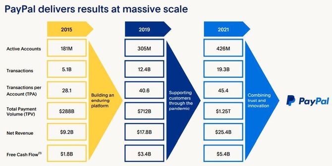 또한 활성 계정 수, 거래 수, 결제 대금 처리, 수익 등 모든 부분에 있어 꾸준한 성장세를 보였으며 코로나 팬데믹 이후에는 더욱 가속화되어 성장하는 모습을 보여주고 있다. 이를 통해 페이팔의 기존, 그리고 앞으로의 인프라가 튼튼할 것임을 예측할 수 있다.
