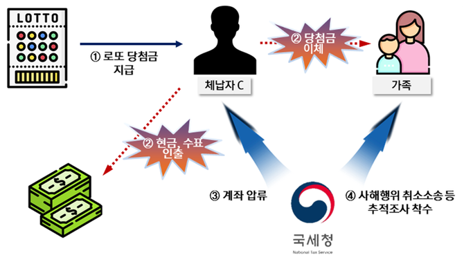 운 좋게도 C는 수십억 원 상당의 로또복권 1등에 당첨돼 체납을 해결할 수 있었지만, 세금을 내지 않을 의도로 당첨금 일부는 가족 계좌로 넣어두고, 일부는 현금·수표로도 인출했다.