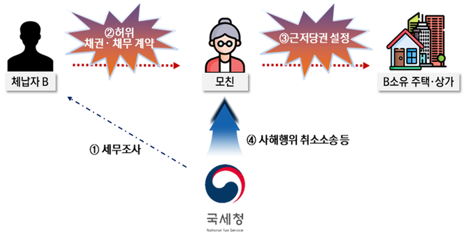 국세청이 오로지 체납처분 회피를 목적으로 서류상으로만 채무 채권을 맺었다고 추정, 재산추적조사를 통해 실제 돈이 오간 바 없는 허위의 근저당임을 확인했다.