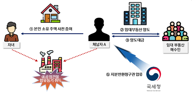 국세청은 A의 임대부동산 양도대금에 대한 금융거래내역 등에 대한 재산추적조사 착수한 후 합유취득 공장건물에 대해서는 지분반환청구권(채권) 압류 및 추심금 청구소송, 자녀에게 증여한 주택에 대해 사해행위 취소소송을 통해 압류처분에 착수했다.