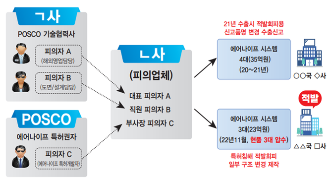 이들 일당 가운데 B씨가 회사를 나가자 주범 A는 아예 포스코 에어나이프 특허기술 개발자인 C씨를 부사장으료 영입해 해당기술을 도용, 에어나이프 3대를 해외 철강사에 팔아치우려다 2022년 9월 국정원에 감지, 사안을 전달받은 ‘인천세관 기술유출 범죄 수사팀’에 적발됐다.