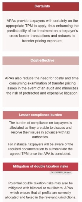 납세자는 이 제도로 국외특수관계인간 거래에서 적용할 정상가격 산출방법 및 정상가격 범위에 대해 과세당국과 사전에 서로 합의, 적용할 수 있다. 국세청은 해마다 내는 <APA 연차보고서>에서 APA가 납세자에게 제공하는 혜택을 기술하고 있다.