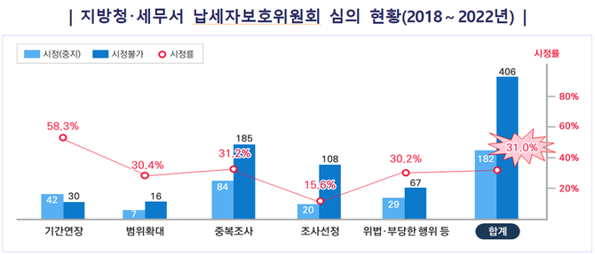 (조세금융신문=고승주 기자) 국세청(청장 김창기)은 지난해까지 5년간 전국 지방청, 세무서 납세자보호위원회를 통해 권리보호요청을 받은 위법‧부당한 세무조사 청구건 588건 가운데 182건을 시정조치했다고 13일 밝혔다.