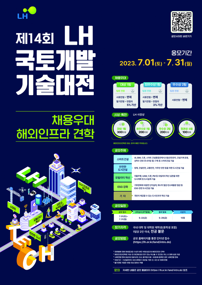 (조세금융신문=이정욱 기자) 한국토지주택공사(LH)가 내달 1일부터 31일까지 국내 대학(원)생을 대상으로 '국토개발기술대전’ 작품을 접수한다고 밝혔다.