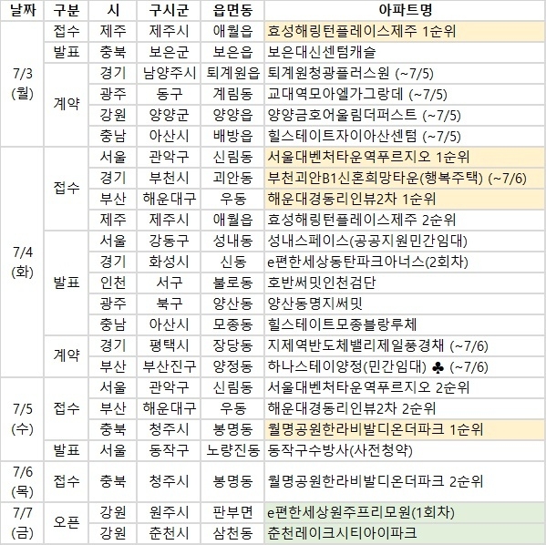 주요 분양 단지는 서울 관악구 신림동 '서울대벤처타운역푸르지오', 부산 해운대구 우동 '해운대경동리인뷰2차', 제주 제주시 애월읍 '효성해링턴플레이스제주' 등이다.