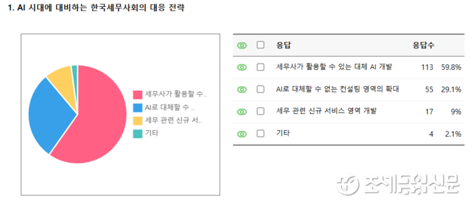 'AI(인공지능) 시대에 대비하는 한국세무사회의 대응 전략'에 대해서는 △세무사가 활용할 수 있는 대체 AI 개발(113명, 59.8%)과 △AI로 대체할 수 없는 컨설팅 영역의 확대’(55명, 29.1%)를 가장 많이 선택했다.