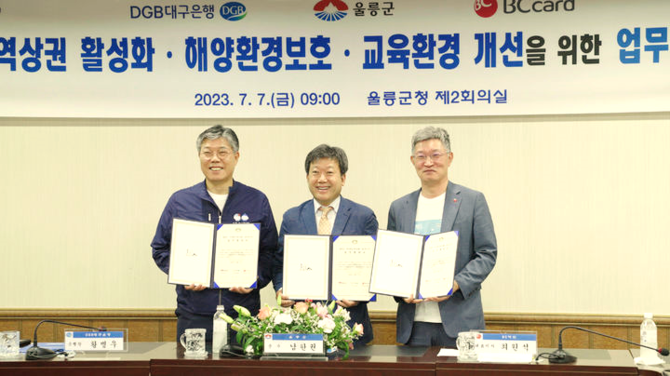8일 BC카드는 전날 경북 울릉군 소재 울릉군청에서 대구은행, 울릉군청과 함께 ESG 마케팅 추진 협약을 맺었다면서 울릉군 소재 가맹점 결제 시 최대 15만원 할인, 해양청소기금 전달, 도서산간교육 지원, 우리독도카드 상품 리뉴얼 등을 통해 울릉 지역 상권을 활성화할 계획이라고 밝혔다.