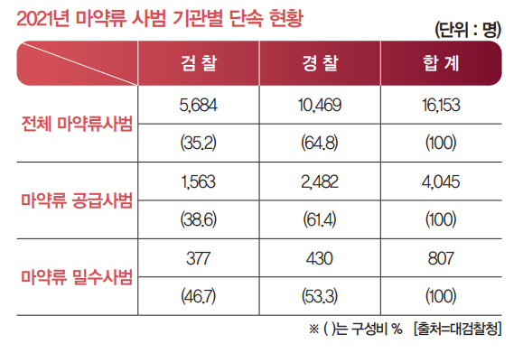 2022 년 검찰이 발표한 단속된 마약류 사범 단속 누계는 총 1만8395명이다. 아래 표에서 보듯2021년(1만6,153명)보다 2000여명 늘었고, 기존의 최다 기록을 갱신한 수치다. 마약류 사범이 급격한 증가 추세를 보이고 있다.