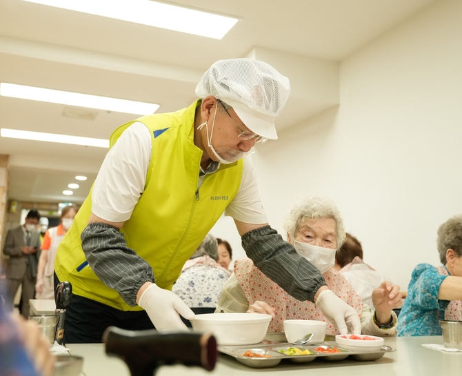 이석준 NH농협금융 회장과 봉사단은 삼계탕과 수박 등 여름철 보양식을 준비하는 한편 돌봄 시설 내 노후 선풍기 교체를 지원했다.