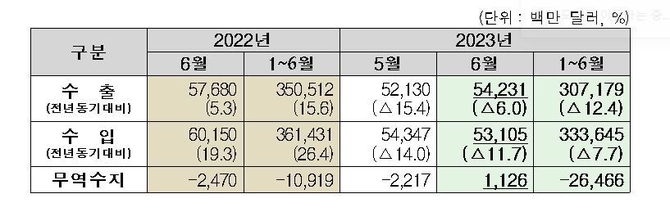 관세청에 따르면 6월 수출은 500달러를 상회하였으나 지난 22년 6월 수출액 최대치를 기록했던 기저효과로 인해 전년동기대비 감소했다.