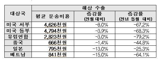 전월 대비 원거리인 미국 서·동부는 각각 8.0%, 3.9%로 하락했으며, 유럽연합(-3.0%) 근거리인 중국(-1.4%), 일본(-13.0%), 베트남(-15.0%)등으로 운송비용이 모두 감소했다.
