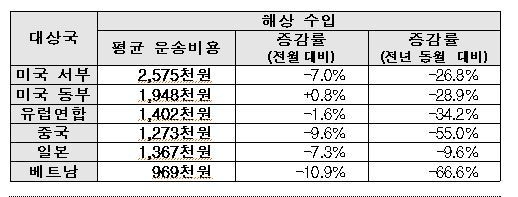 해상으로 수입할 때 드는 운송비의 경우 미국 서부가 (-1.7%), 유럽연합이 (-1.6%), 베트남 (-10.9%), 중국(-9.6%), 일본(-7.3%)등이 한 달 전보다 하락했다. 반면 미국 동부는 0.8%상승했다.