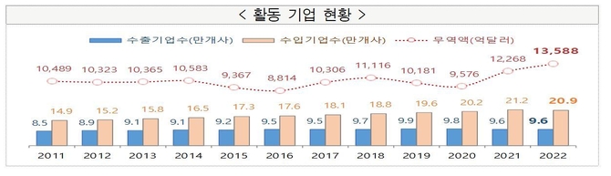 관세청이 27일 발표한 '2022년 기업무역활동 통계'에 따르면, 수출 활동기업은 344개사(+0.4%) 증가한 반면, 수입 활동기업은 3,468개사(△1.6%) 감소한 것으로 나타났다.