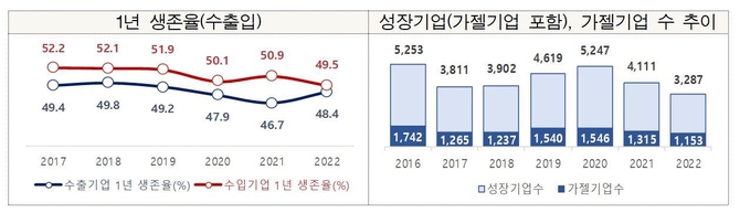수입기업 1년 생존율은 49.5%로 전년대비 1.4%p하락했으며, 5년 생존율은 18.7로 전년대비 0.2%p하락했다.