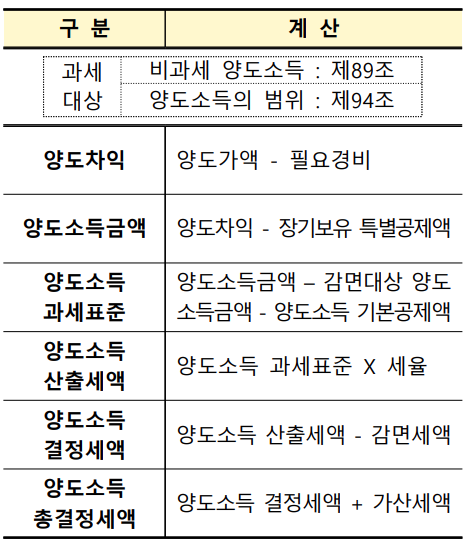 개정안은 양도가액에서 필요경비를 차감하여 양도차익을 구하고 장특공제를 차감하여 양도 소득금액을 구하는 과정과 과세표준 이후까지 한 눈에 보기 쉽게 도표로 정리했다.