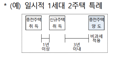 "국내에 1주택을 소유한 1세대가 그 주택(이하 이 항에서 “종전의 주택”이라 한다)을 양도하기 전에 다른 주택(이하 이 조에서 “신규 주택”이라 한다)을 취득(자기가 건설하여 취득한 경우를 포함한다)함으로써 일시적으로 2주택이 된 경우 종전의 주택을 취득한 날부터 1년 이상이 지난 후 신규 주택을 취득하고 신규 주택을 취득한 날부터 3년 이내에 종전의 주택을 양도하는 경우(제18항에 따른 사유에 해당하는 경우를 포함한다)에는 이를 1세대1주택으로 보아 제154조제1항을 적용한다."