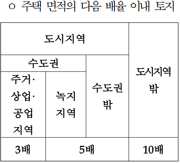 주택 면적의 다음 배율 이내 토지 ㉠ 도시지역 - 수도권 내 주거지역·상업지역 및 공업지역 : 3배 - 수도권 내 녹지지역 : 5배 - 수도권 밖 : 5배 ㉡ 그 밖의 지역 : 10배