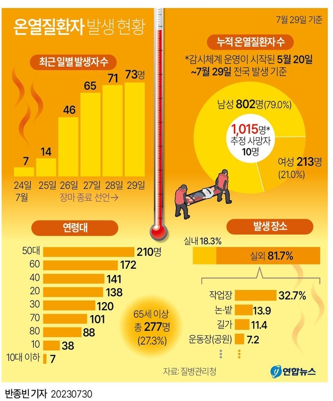 감시체계 운영이 시작된 5월 20일부터 누적 온열질환자는 1천15명으로 이달 29일을 기해 1천명을 넘어섰고, 누적 추정 사망자는 총 10명이 됐다. 질병청에 따르면 온열질환자 연령대는 65세 이상의 노인이 27.3% 가장 많고, 50대가 20.7%로 뒤를 이었다. 성별로 보면 남성이 79.0%, 여성이 21.0%다.