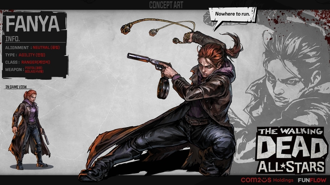 ‘워킹데드: 올스타즈’는 펀플로가 개발하고 컴투스홀딩스가 글로벌 서비스하는 수집형 RPG다. 스카이바운드 엔터테인먼트의 ‘워킹데드’ 오리지널 코믹스 IP를 기반으로 한 이 게임은 암울한 포스트 아포칼립스 분위기를 생생하게 구현했다. 생존을 위해 사투를 벌이는 인기 원작 캐릭터들과 자체 개발한 창작 캐릭터들이 대거 등장한다.