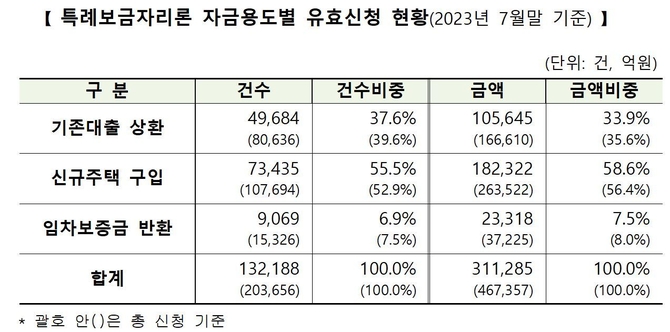 7월 말 기준 자금용도별로 살펴보면, 유효신청액은 신규주택 구입 용도가 18조2322억원(7만3435건)으로 전체의 58.6%를 차지했다.