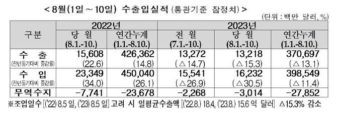 관세청은 11일 8월1일부터 10일까지의 수출입현황을 발표하고, 수출은 132억달러로 전년동기대비 15.3%감소했다고 밝혔다.