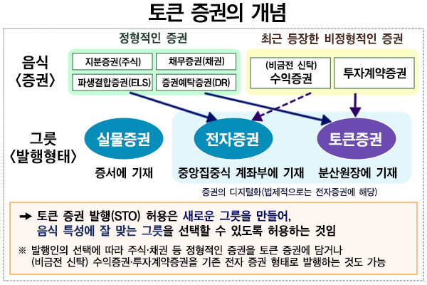 ICO를 전면 금지하는 것과 달리 우리 정부는 전자증권법·자본시장법을 개정하여 STO를 법제화하여 전면 허용했다. K-STO로 불리는 토큰증권법에 따라 기존 증권 원장에 분산원장(블록체인)을 추가하여 분산원장에 기록된 정보에 기초한 전자증권을 증권으로 발행을 허용한다.