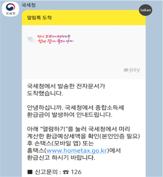 국세청은 인적용역 소득 있고, 일정 수입 미만인 경우 24일, 25일 이틀간에 걸쳐 모바일 환급 안내문(카카오톡)을 발송한다.