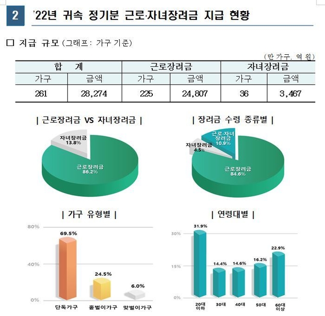 이는 작년에 지급됐던 21년도 귀속 정기분 근로·자녀장려금 지급규모 291만가구, 2조 8604억원에 비해 가구수는 30만가구가 줄었고, 지급액은 330억원 가량 감소한 금액이다.