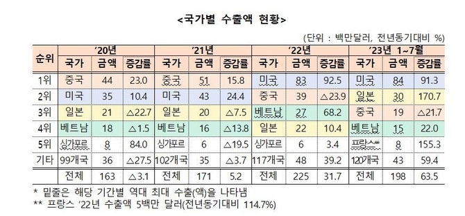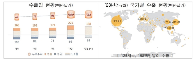 관세청의 자료에 따르면 코로나 팬데믹(2020년)이후 감소한 수출이 점진적 회복세를 보이다 엔데믹을 맞은 올해 가파른 증가세를 보이며 올해 6월 수출 중량은 583톤으로 월간 기준 역대 최대 규모를 기록했다.