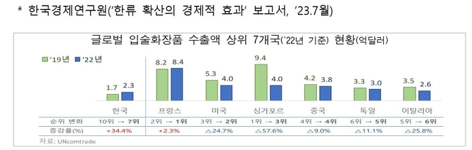 한민 담당관이 제시한 ‘한국경제연구원 한류 확산의 경제적 효과 보고서’에 따르면 22년 기준으로 글로벌 입술화장품 수출액이 상위 7개국 중에서 우리나라는 10위에서 7위로 변동됐으며, 34.4%가 증가했다.