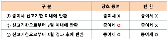 ② 증여세 신고기한으로부터 3개월 이내 반환 (증여한 달의 말일부터 3개월 ~ 6개월 이내)