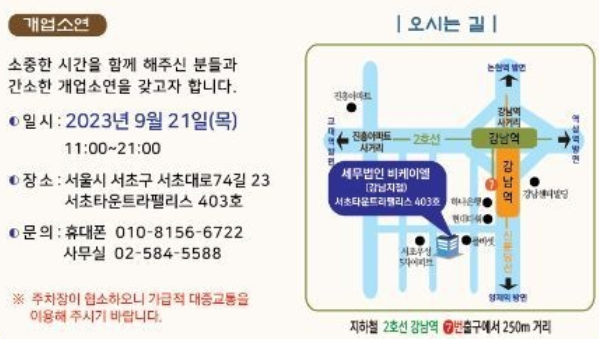 21일 개업소연은 서울시 서초구 서초타운트라팰리스 403호에서 오전 11시부터 오후 9시까지 진행된다.