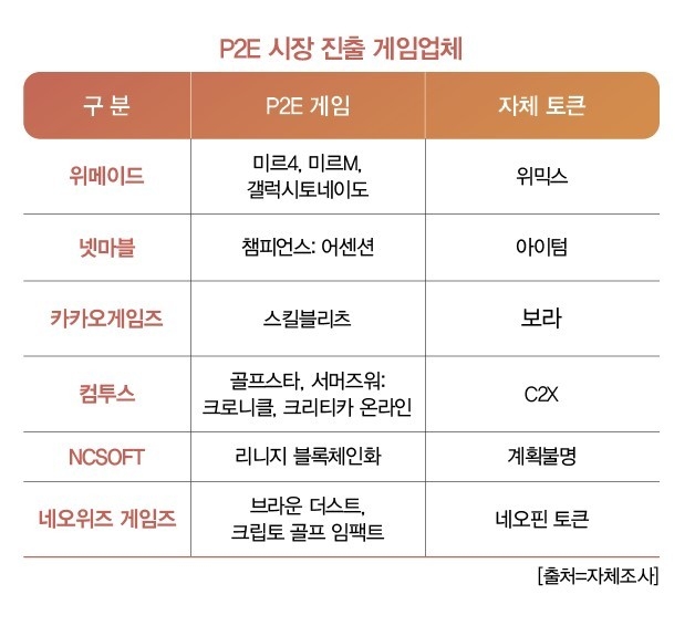 앞서 설명한 글로벌 P2E 게임인 Axie Infinity 외에도 국내 기업들이 만든 P2E 게임들이 있다. 카카오게임즈의 블록체인 게임 플랫폼 메타보라와 글로벌 모바일게임 개발사이자 퍼블리셔인 모비릭스가 파트너사로 함께 만든 하이퍼 캐주얼 장르 P2E 게임 ‘스킬블리츠’, 컴투스의 ‘서머너즈 워: 크로니클’, 위메이드’의 미르4 등 다양한 P2E 게임들이 쏟아져 나오고 있다.