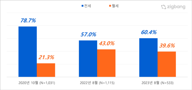 직방 관계자는 "역전세 공포가 누그러지면서 전세 거래를 선호하는 비율이 소폭 증가한 것으로 보인다"고 설명했다.